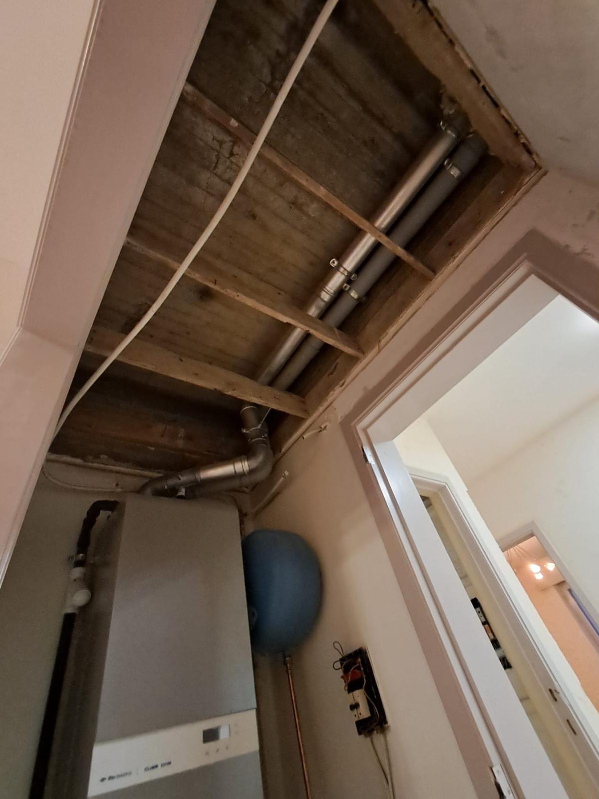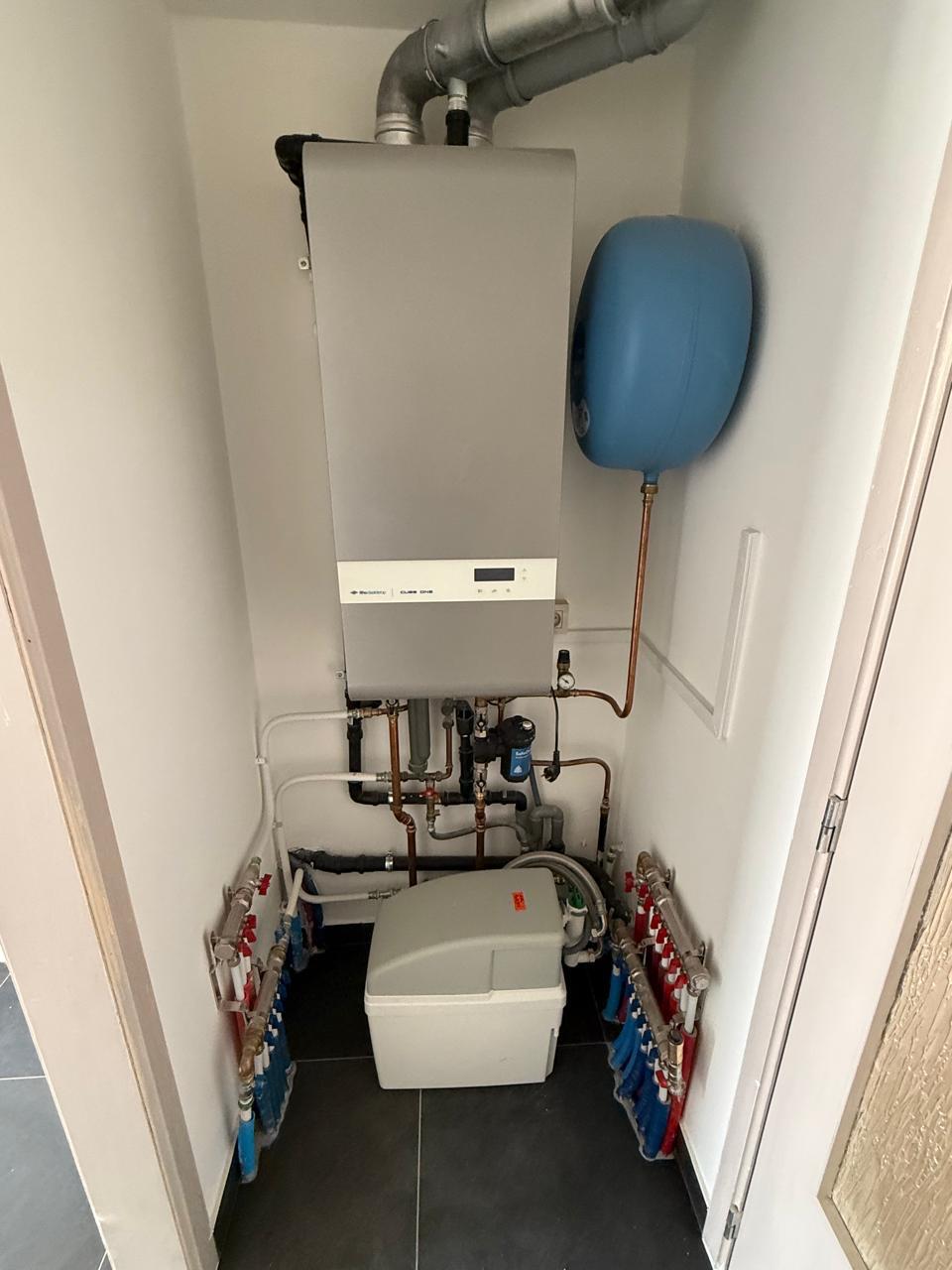 Sur cette base, nous avons ensuite planifié et réalisé les nouvelles installations. Les travaux ont commencé par la plomberie, avec la mise en place des conduites principales — évacuations, alimentation en eau, chauffage — en APEX (multicouche), ainsi que l’installation d’un système de collecteurs et l’adaptation à la chaudière gaz existante.