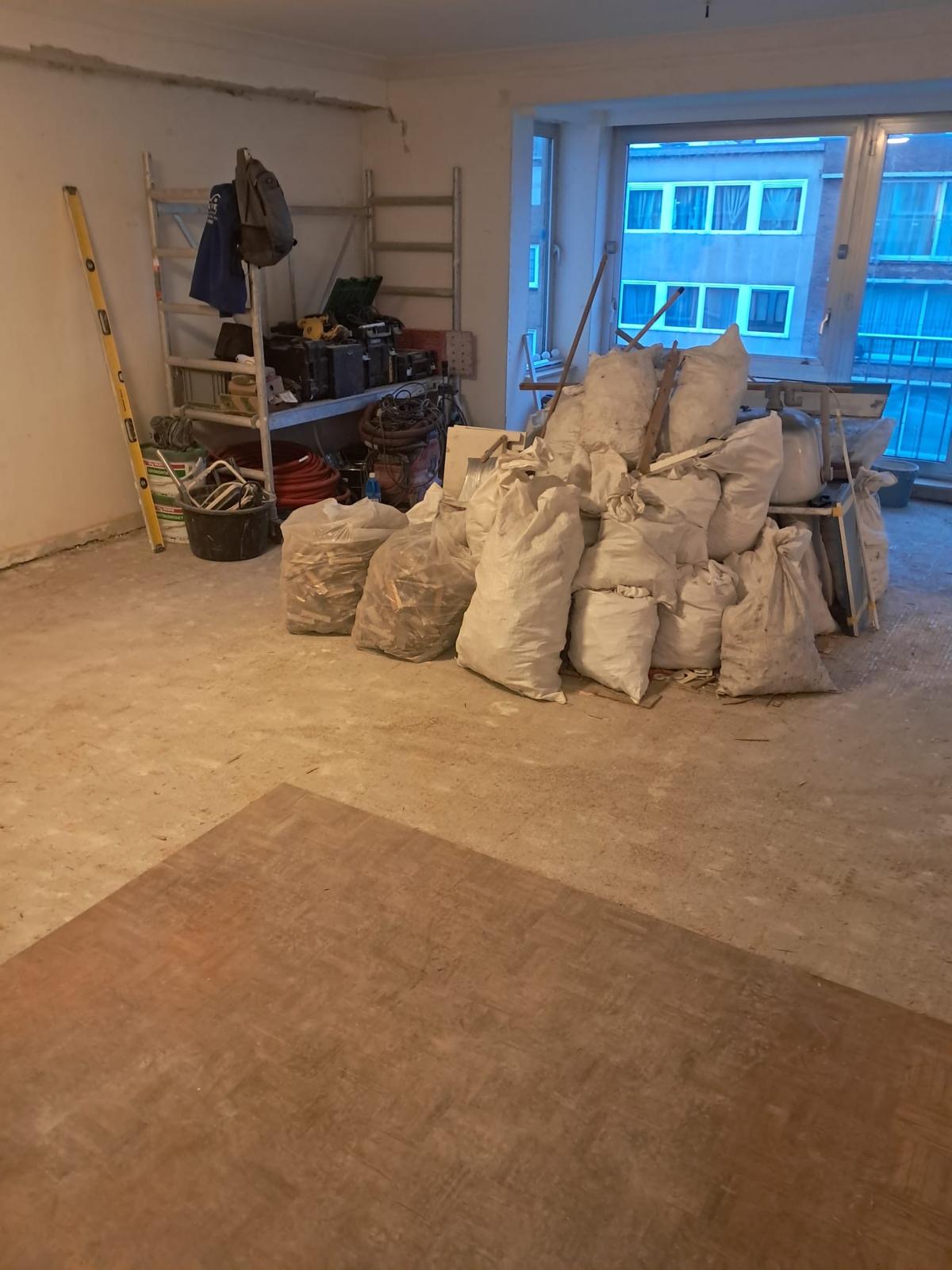 Lors de cette première étape, nous avons procédé à la dépose complète de la salle de bain, au démontage des plafonds, à l’enlèvement de l’ancien parquet ainsi qu’à divers petits travaux de démolition.