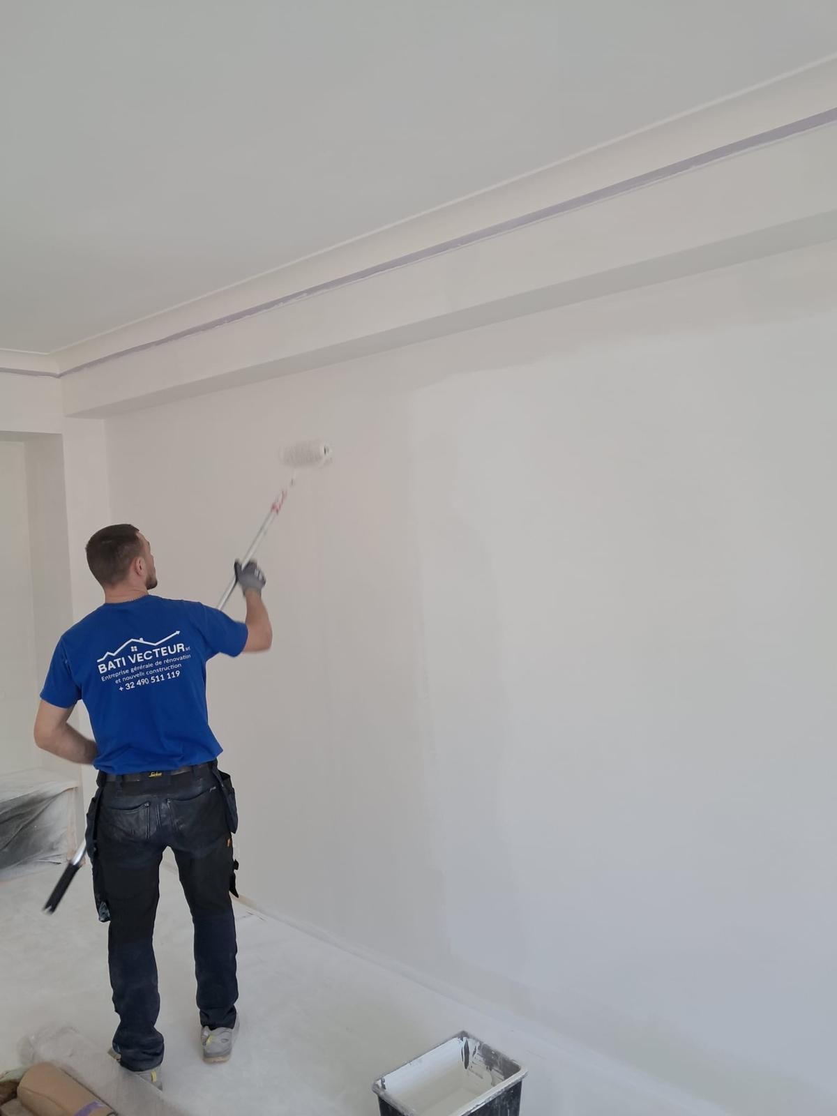 Les travaux d’enduisage réalisés par BATI VECTEUR SRL ont été effectués avec des outils professionnels garantissant un excellent nivellement des surfaces. Sur ce chantier, nous avons également utilisé la technique d’application de l’enduit de finition au rouleau, permettant d’obtenir un rendu homogène et de haute qualité.